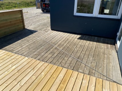 Ved at fjerne alger mv. får du efter et stykke tid igen en flot og præsentabel terrasse. For længere holdbarhed kan overfladerne efterfølgende imprægneres.